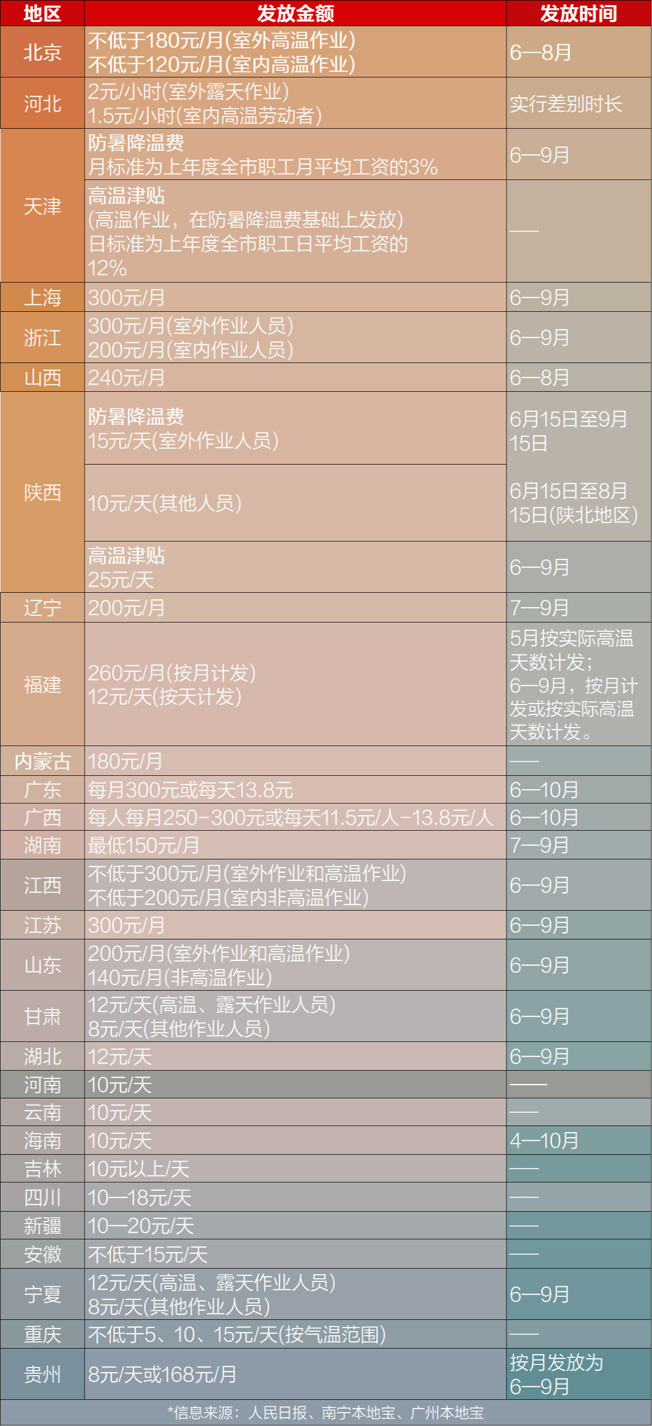 每個地區,高溫津貼的領取時間、金額會有所不同,一般來說是有6、7、8、9四個月。
