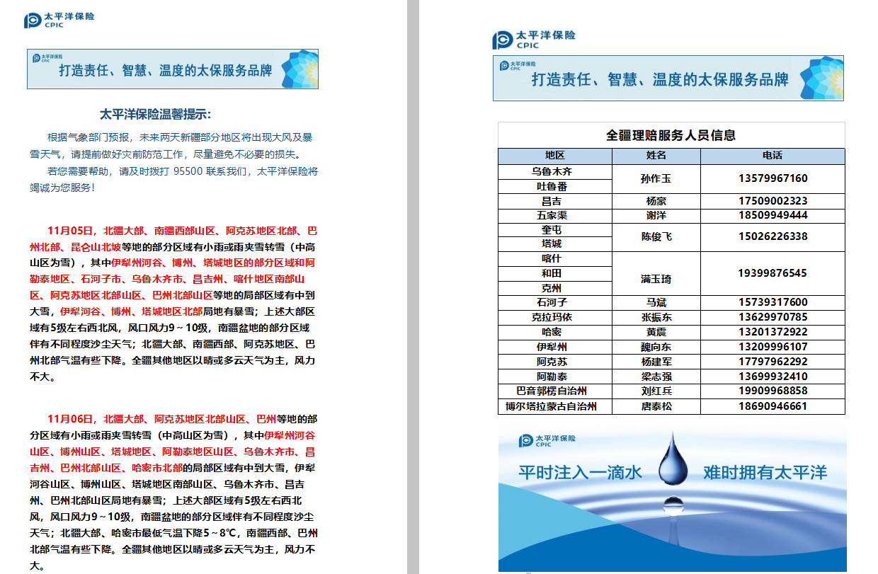 未來兩天新疆部分地區將出現大風及暴雪預警,請注意防范。如需幫助,請致電95500全國客服電話或直接撥打全疆理賠服務電話 ? 太平洋保險在您身邊!